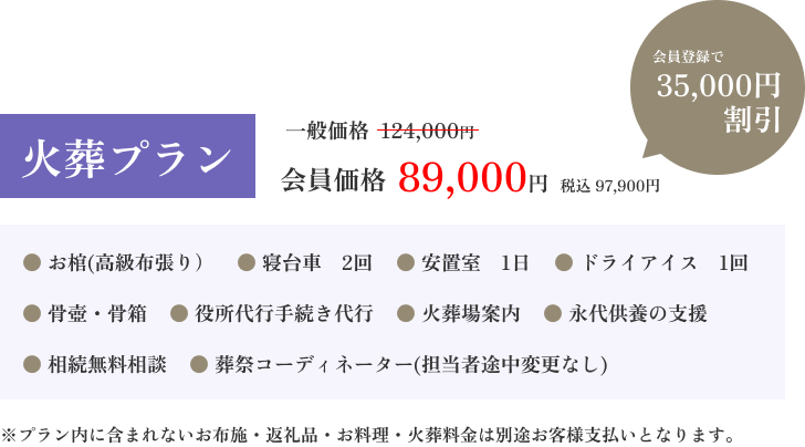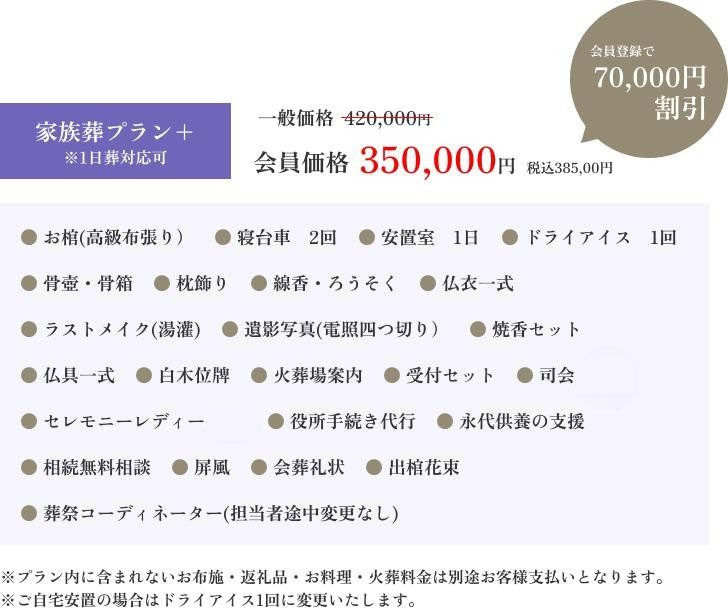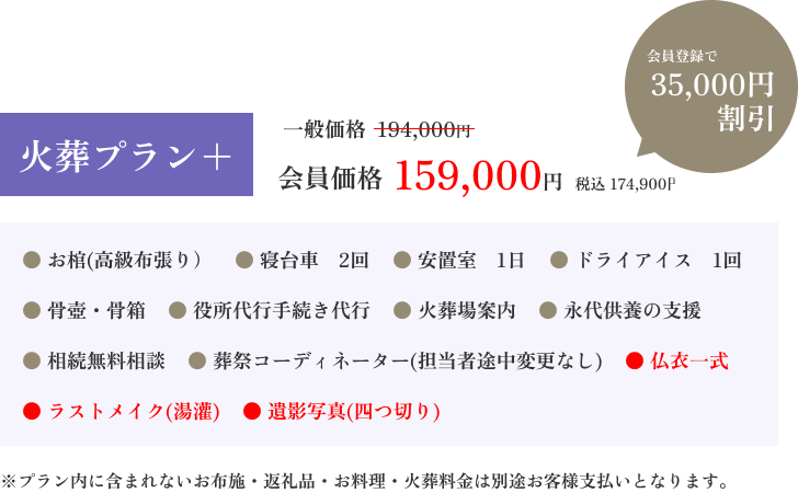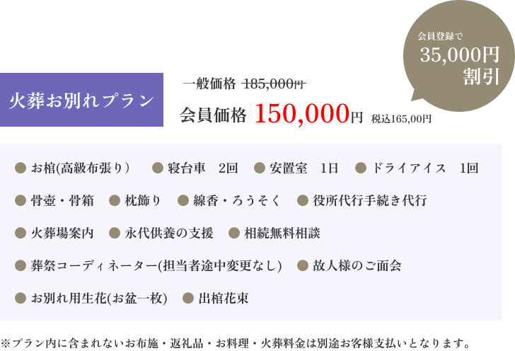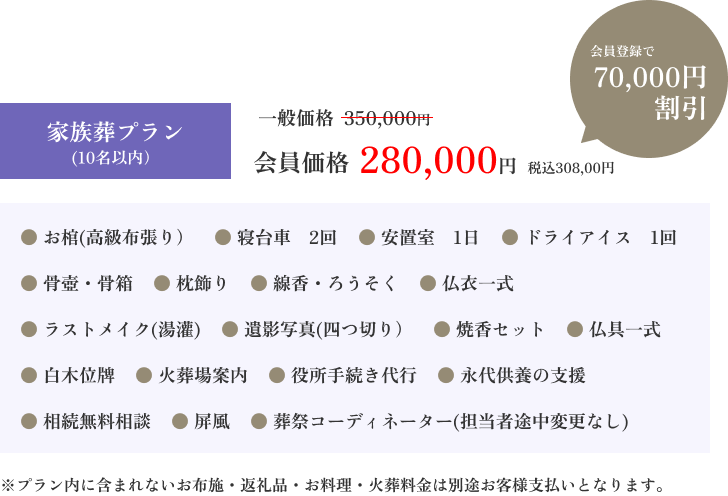 ご要望に合わせ、自由にプランづくりを 故人様への想いをお花に託して送りたい…安心価格の葬儀基本コース。 下記のほか、故人様、ご家族のご要望にそったプランをご提案いたしております。 何なりとお申し付けください。 施工例